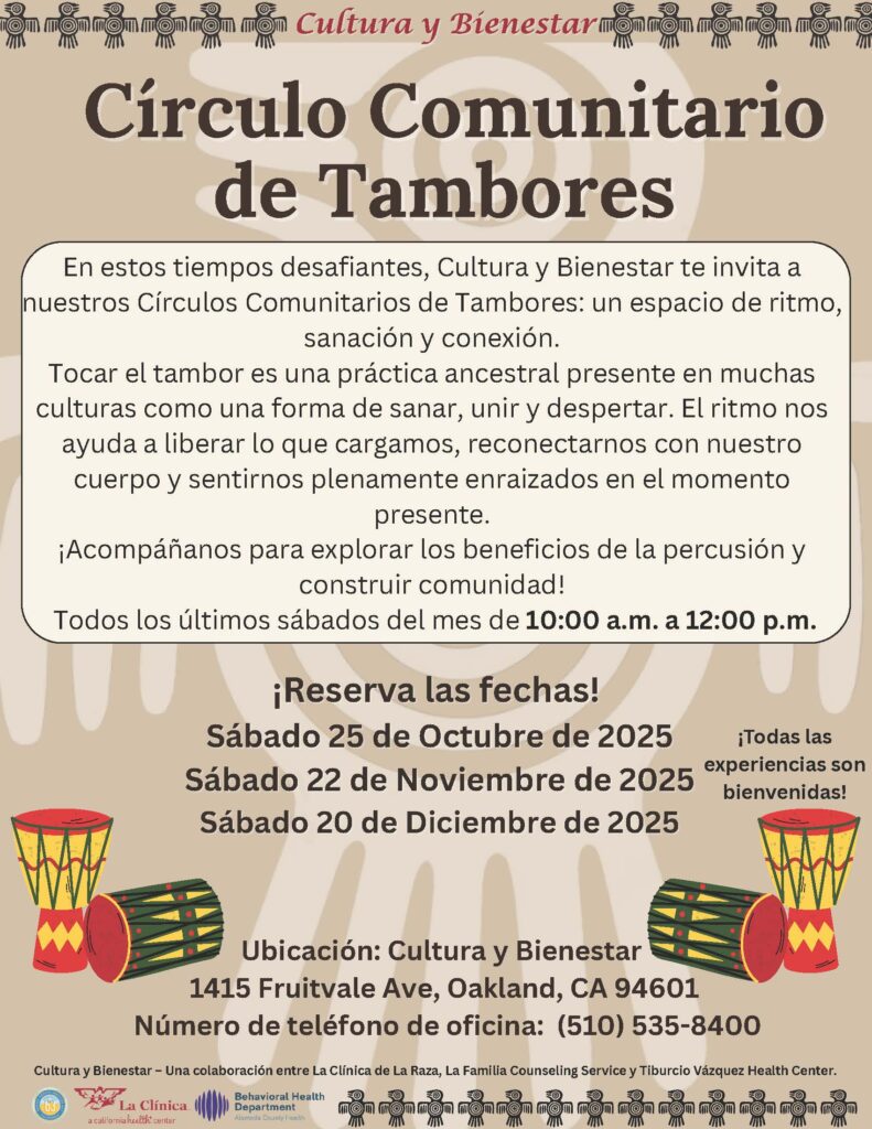 Cultura y Bienestar te invita a nuestros Círculos Comunitarios de Tambores: un espacio de ritmo sanación y conexión.