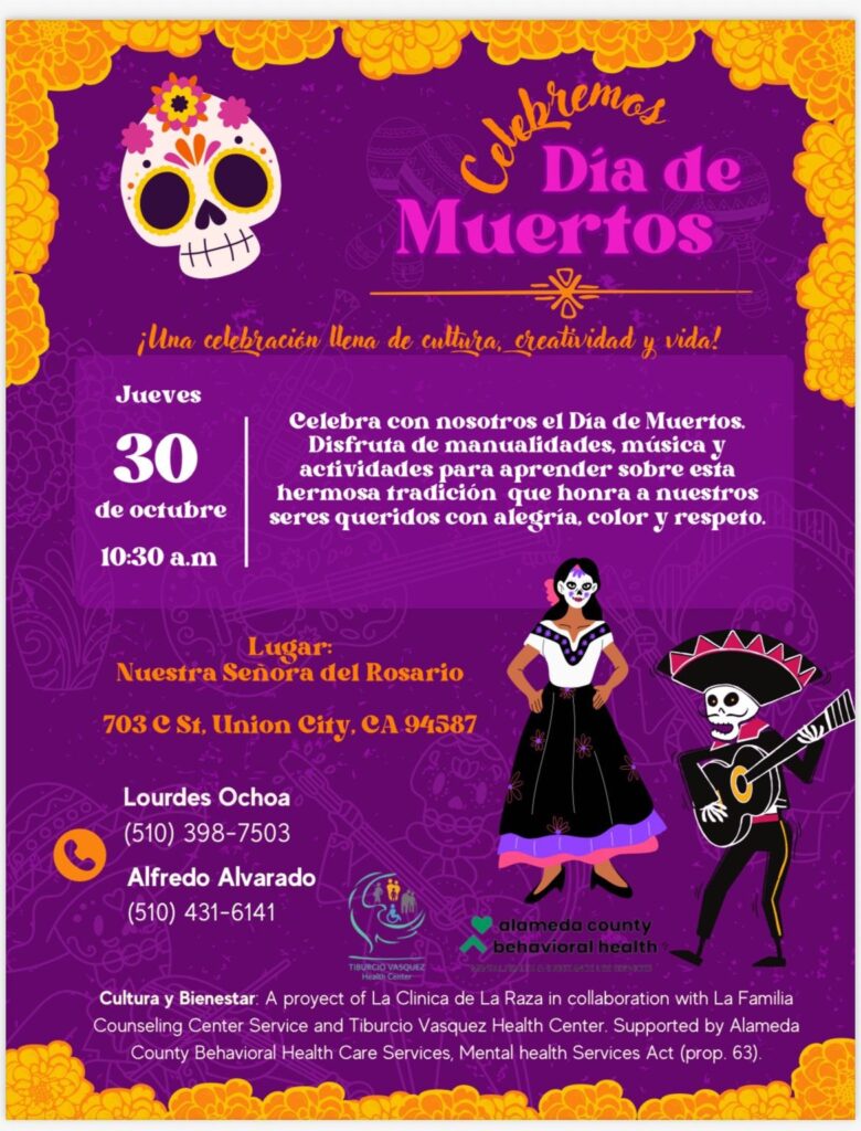 Celebra con nosotros el Día de Muertos. Disfruta de manualidades, música y actividades para aprender sobre esta hermosa tradición que honra a nuestros seres queridos con alegría, color y respeto.